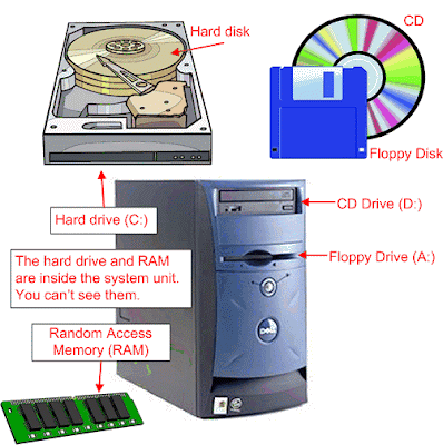 The system unit is the actual computer; everything else is called a peripheral device. Your computer's system unit probably has at least one floppy disk drive, and one CD or DVD drive, into which you can insert floppy disks and CDs. There's another disk drive, called the hard disk inside the system unit, as shown in Figure 2. You can't remove that disk, or even see it. But it's there. And everything that's currently "in your computer" is actually stored on that hard disk. (We know this because there is no place else inside the computer where you can store information!).